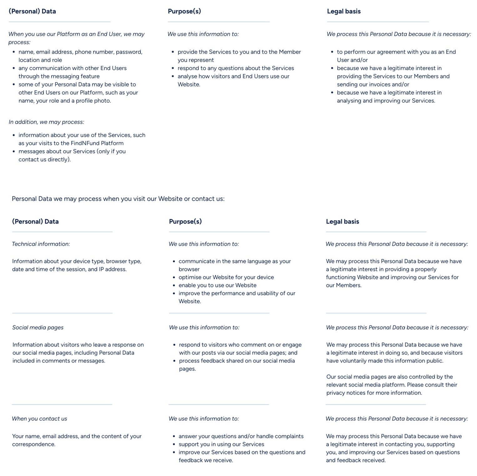 1. Who we are and what we offer We are FindNFund B.V. ("FindNFund", "we", "us" or "our"). We developed the FindNFund Platform. The FindNFund Platform is an online meeting and collaboration environment that connects charitable organisations and social initiatives ("Finders") with professional donors and foundations ("Funders"). Finders and Funders together are Members of the Platform.